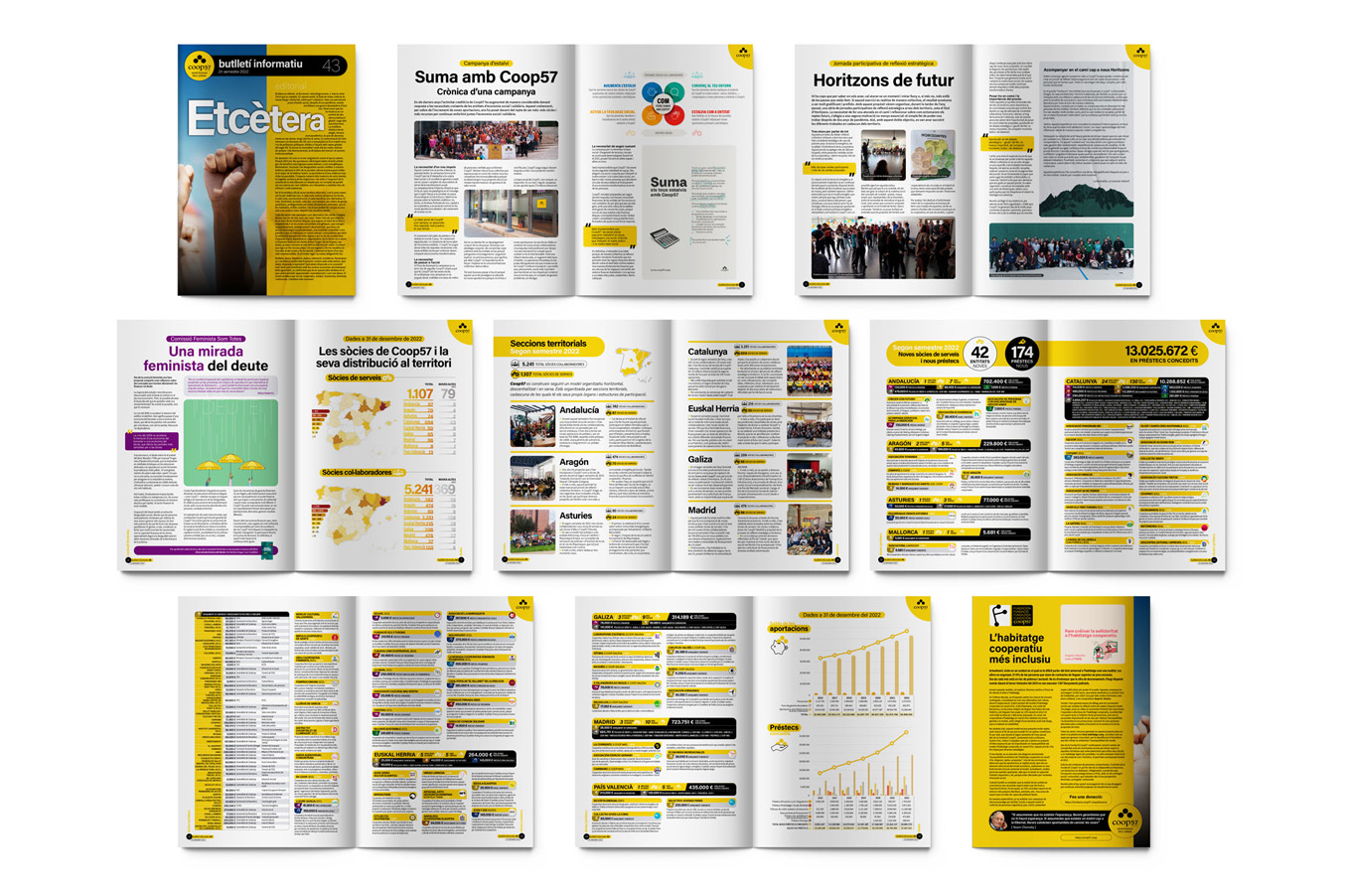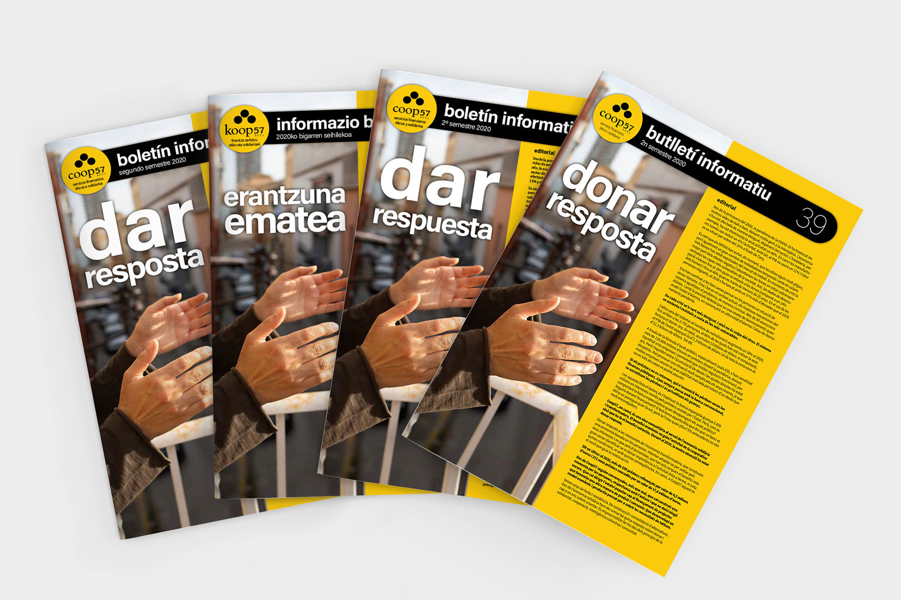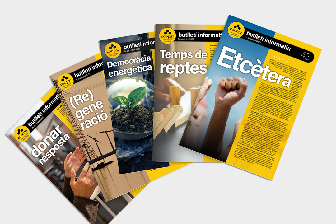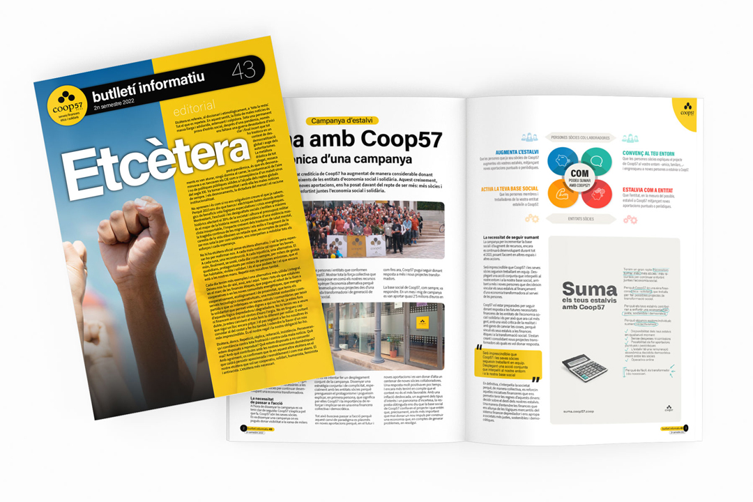 Des de l’any 2001, COOP57 confia en nosaltres el disseny gràfic i la maquetació del butlletí informatiu de la cooperativa de serveis financers ètics i solidaris. Hem desenvolupat una línia gràfica clara i coherent que evoluciona amb el temps per transmetre els valors de COOP57 i facilitar la lectura de continguts sobre economia social i solidària.